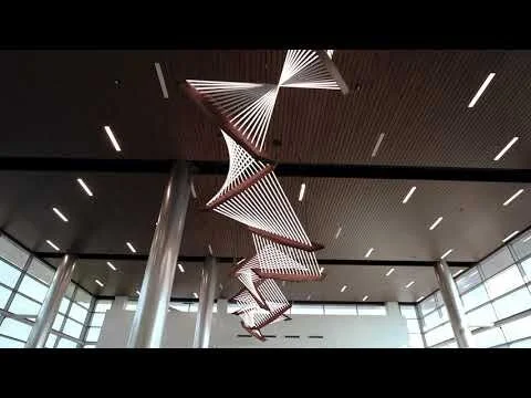 A dancing, meandering path held in tension by sculptural wood bridges invites viewers to become participants. As they walk beneath the sculpture the strings appear to be strumming above, evoking themes of journey, collaboration, and discovery.