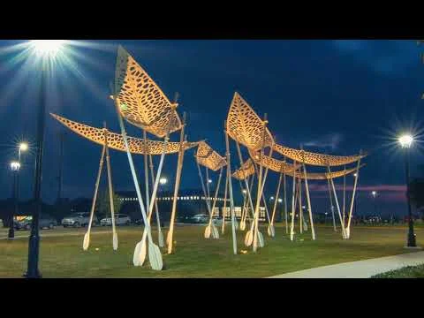 Description: The San Marcos River is considered “The Heart of Texas State University.” Using the River as a metaphor for the student’s journey, Vessels features water jet cut stainless steel forms that poetically evoke both leaves and canoes. The patterns are organic leaf designs that have been parametrically generated to create a visual effect that allows sunlight to pass through in a gradated way. The leaves are a gesture towards the Texas State’s seal, which features a wreath of native oak and laurel leaves, symbolizing strength and victory in knowledge. Long sculptural oars reinforce the vessels metaphor and position the water jet cut forms above viewers, creating dynamic shadow patterns that change throughout the day. The sculpture is powder coated white to visually accentuate itself from the surrounding environment during the day and when dramatically up lit at night. The forms are arranged in a path-like configuration to suggest both leaves and canoes navigating along a water current, evoking the Texas State University student’s journey.